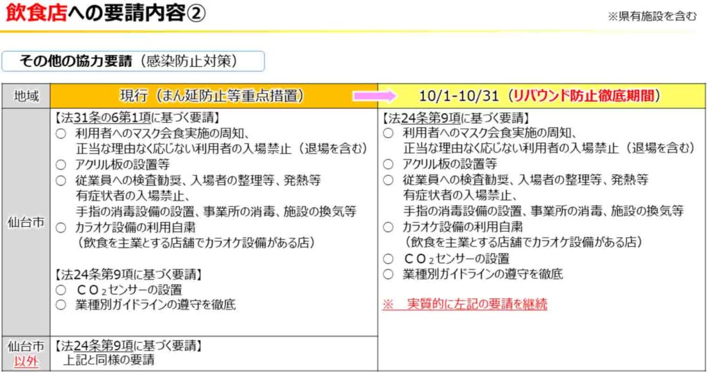 つきましては、2021年9月30日をもちまして宮城県からの時短要請は解除されましたが、以下の通り、宮城県から飲食店に対して「リバウンド防止徹底期間」として「感染防止対策」の継続要請が出ております。